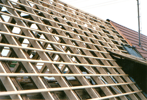 Вилата е строена началото на 80-те години, за покрива са ползвани здрави дебели хоризонтални греди, а за наклонените е ползвано каквото има като дървен материал. Тънки криви, имам чувството че са сечени направо в гората и са сложени. Керамидите са обикновенни керамични. Таванският етаж е обкован от вътре върху тези греди с ламперя и в последствие преди няколко години ги облицовах с гипсокартон. не съм махал ламперята защото отгоре върху нея е страшен боклук. Сега гледам че покрива е почнал да се изкривява, не е напълно прав, а на места като пчели са пропаднали керамидите.