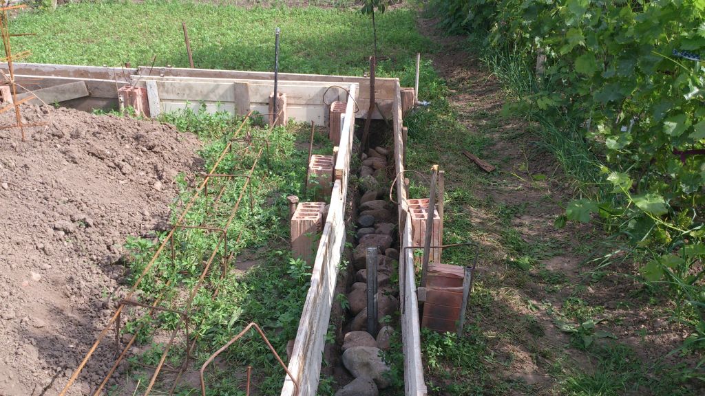 В момента съм излял ивични основи с дълбочина около 40см, широки около 30. Използвани са речни камъни, а частта, която е над земята е с бигли, арматура и по-ситни камъни и бетон разбира се. Остава да се отлее плочата и от тук идват въпросите ми.