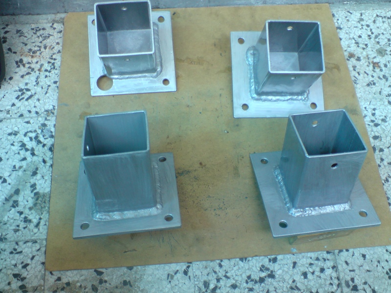 За такава конструкция анкерирана към 4 автомобилни гуми не са ти нужни такива хубави и скъпи планки за анкериране. В долният край на гредите хвани с винтове за дърво ( компромис е да заковеш с пирони) по 4 бр. на греда на кръст парчета от винкели или шини. Около тях можеш да "армираш" с арматура 6 или 8 мм и това е достатъчно. Заливаш с бетон, като не икономисваш цимента.