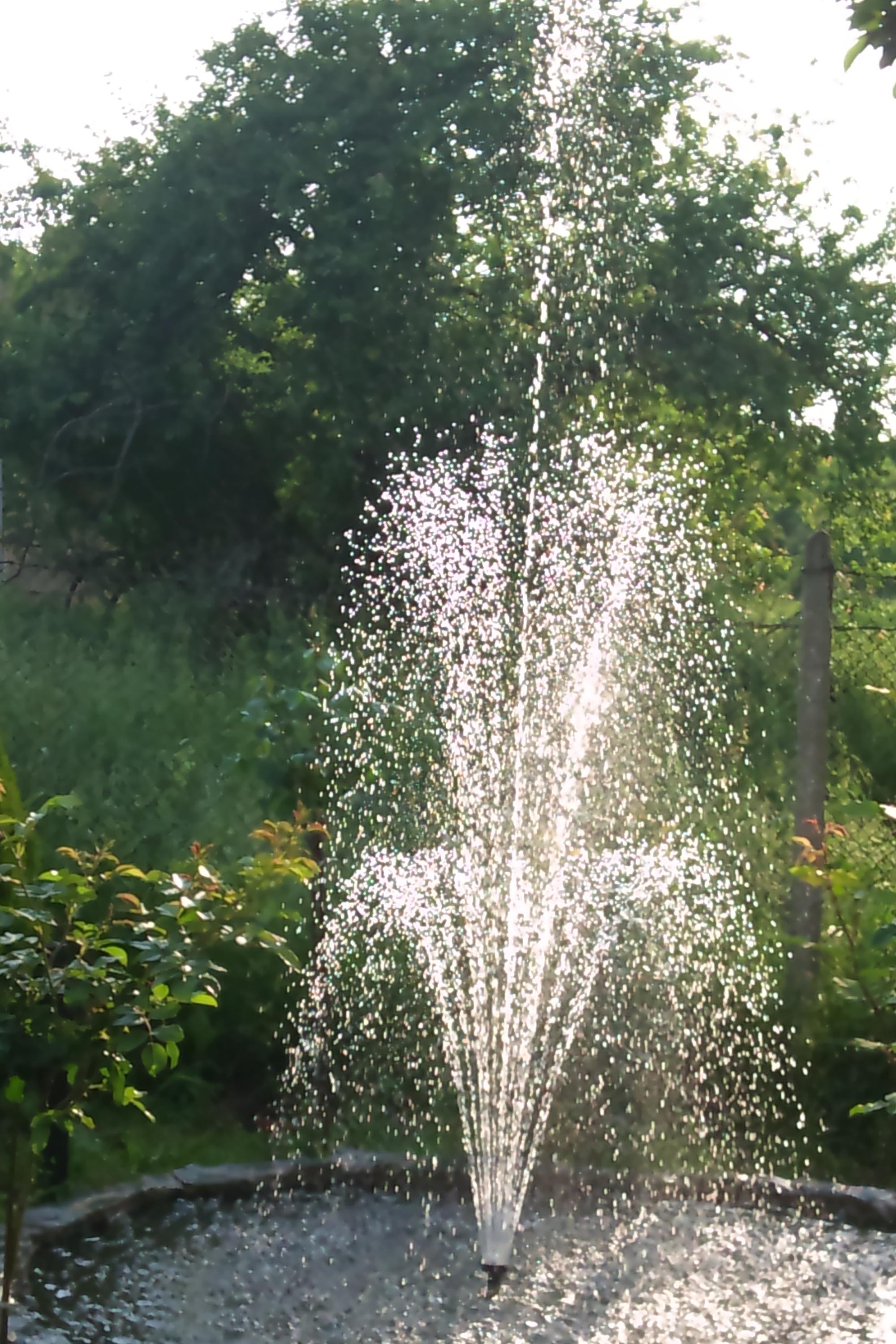 Ето малко инфо:фонтана е стабиляга конструкция(изкоп,полагане на камък за основа,кофраж,арматура,бетон и декоративен черен дялан камък за облицовката)обичам стабилните изпълнения,опцията с фолио е по-лесна но не ми е стабилно.Обема няма и кубик,диаметър 2м дълбочина 30см.Помпата е Вида 3 монтирана в водомерната шахта на около 6м разстояние от фонтана,тръбите са Ф25 подземята полиетиленови в шахтата полипропиленови.