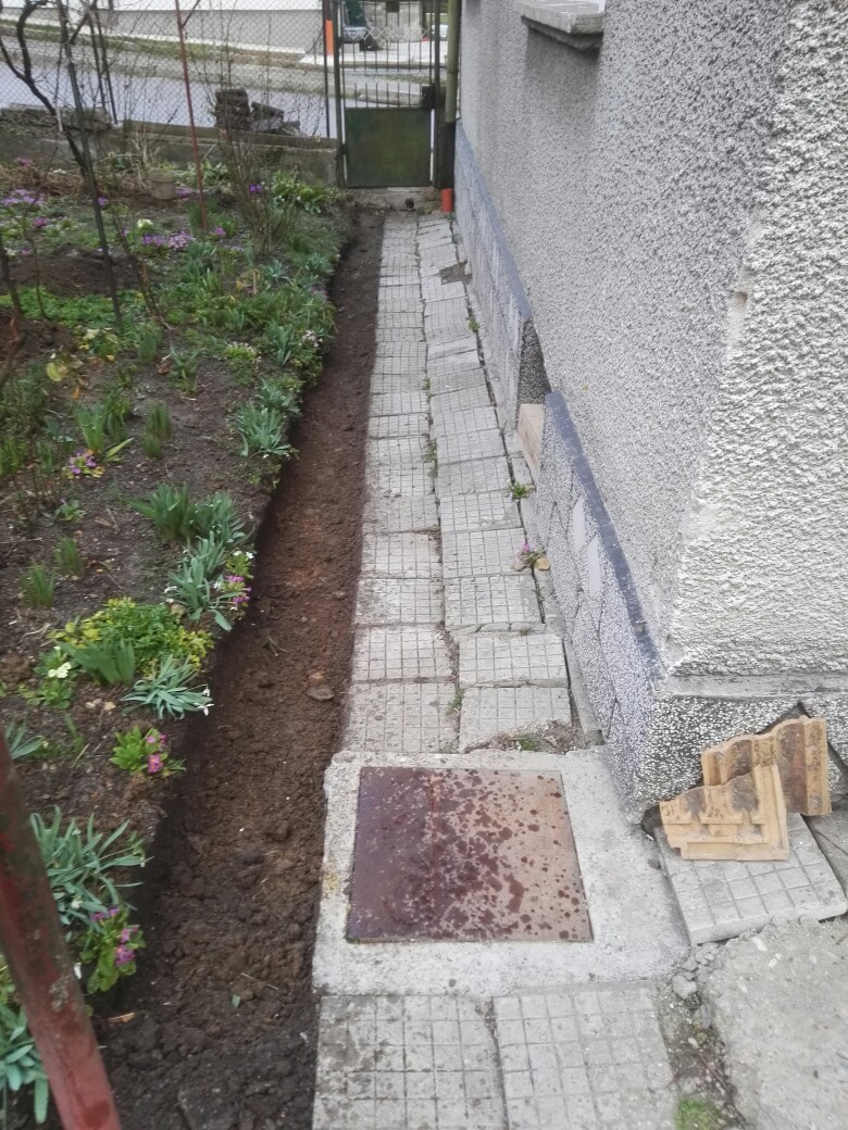 Изкопаваш ивицата за пътеката.По принцип бордюра се слага по височина. За това от двете страни трябва да е по-дълбоко, да има две траншеи в които ще стъпят бордюрите./Аз лично при мен съм ги сложил по ширина/. Трамбоваш, полагаш геотекстил/или дебел найлон, или нищо/, насипваш чакъл, трамбоваш. Насипваш бетон по краищата където са бордюрите, подреждаш ги, и ги нивелираш. От двете страни ги подмазваш/укрепваш/ с бетон. Между бордюрите насипваш още чакъл, нивелираш и трамбоваш. Редиш си арматурата, заливаш с бетон и подравняваш. Като засъхне малко го изпердашваш. След някой ден си нарязваш фугите и си готов.