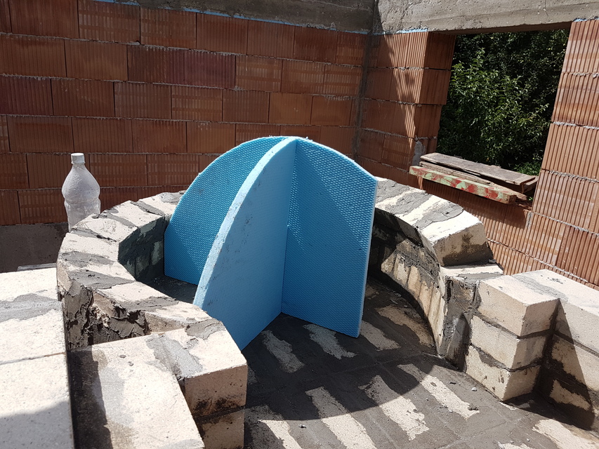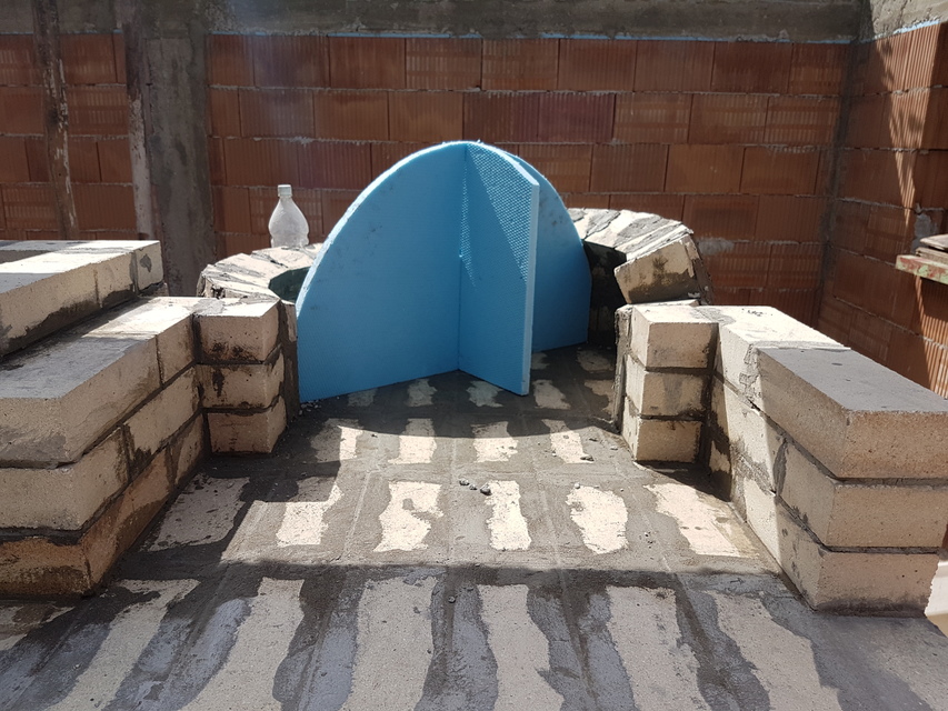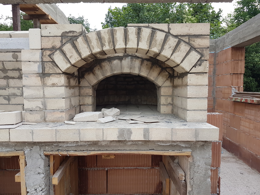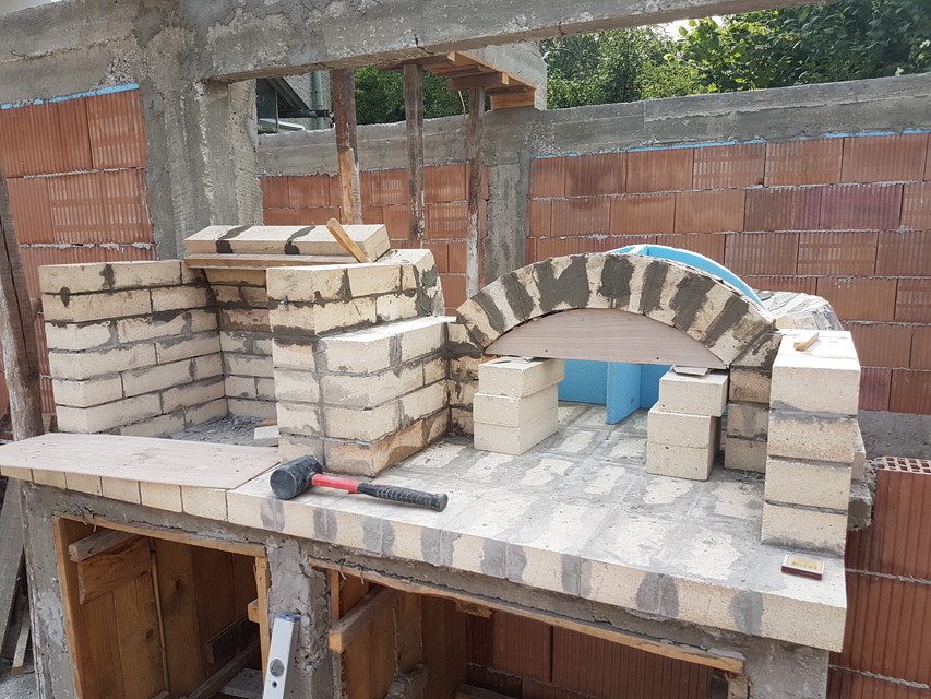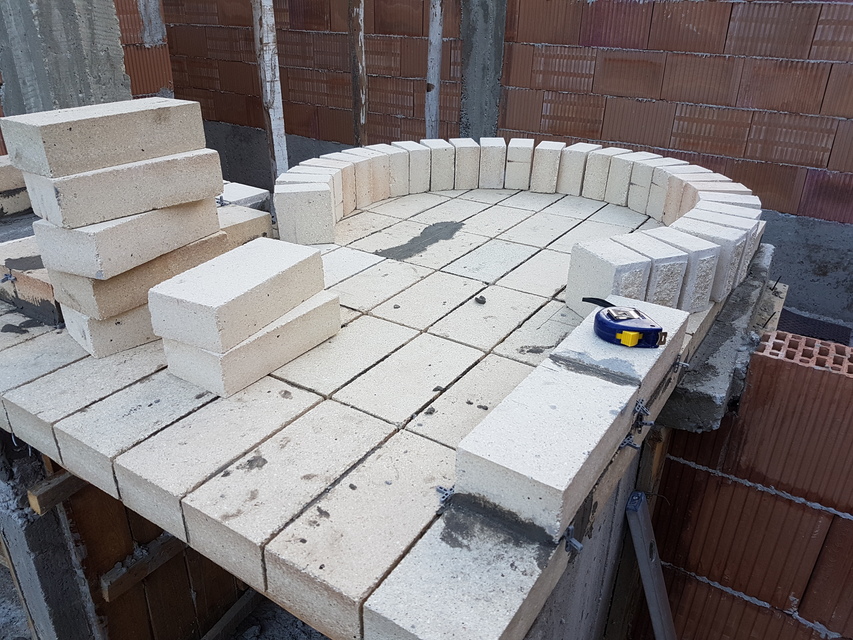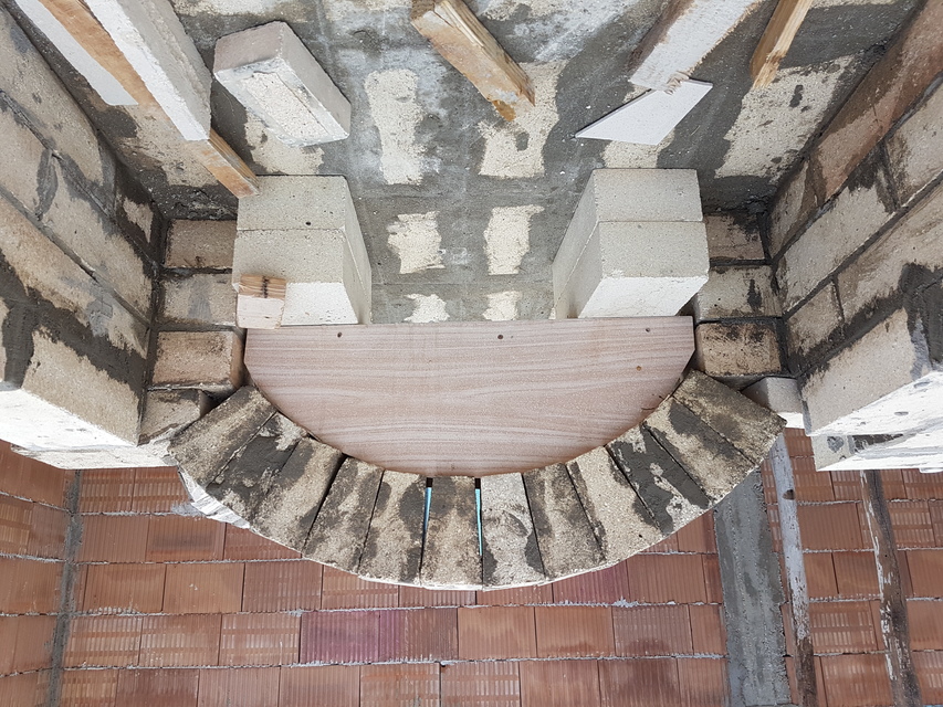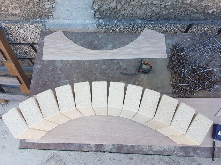 Вътрешната арка е изградена от прави тухли половинки, а предната арка от 18см, за да имаме основа за комина.