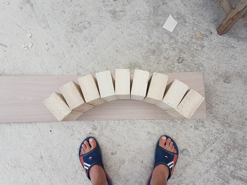 Направихме арката като наредихме тухлите върху една плоскост така, че да се постигне необходимата широчина и височина, след това изрязахме две плоскости и ги наковахме на трупчета за да държат тухлите.