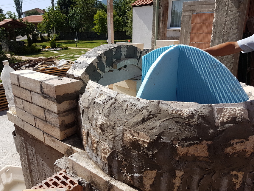 Продължихме с изграждането на пеща. Тук искам да кажа, че според мен, най-добрия вариант за изграждане на пеща е да се използват клиновидни и прави тухли.