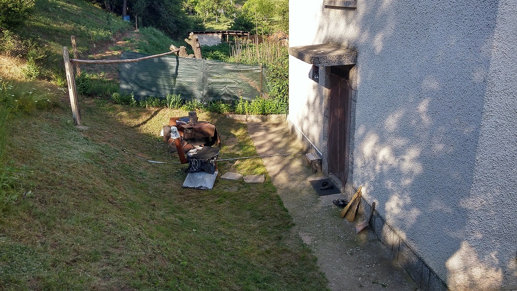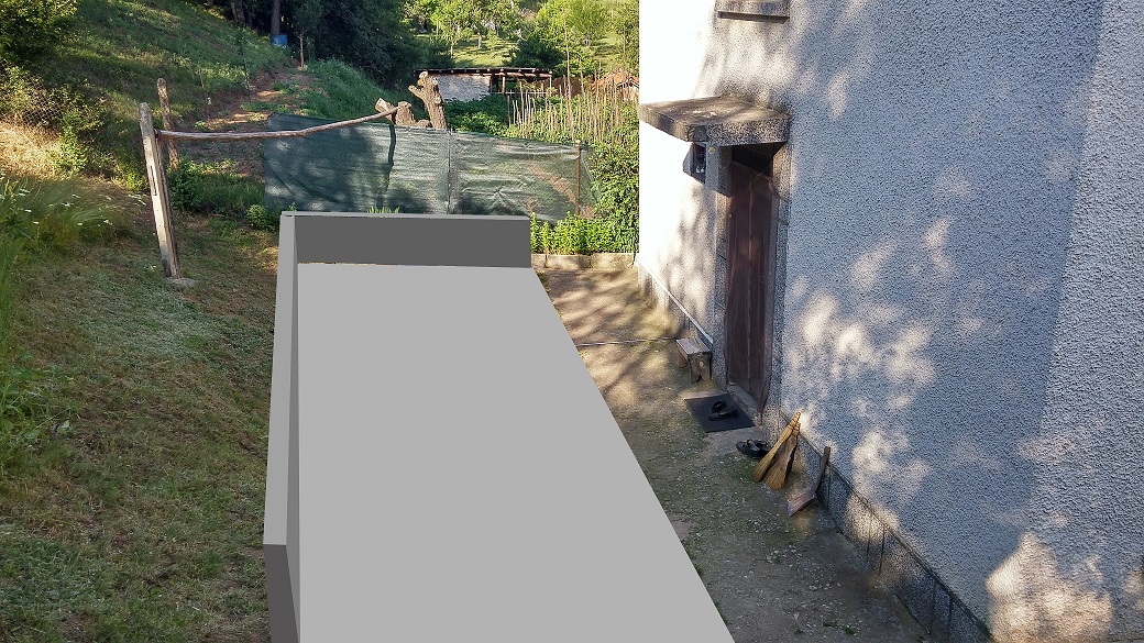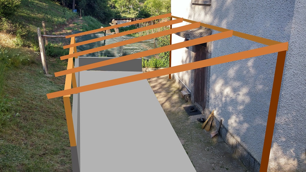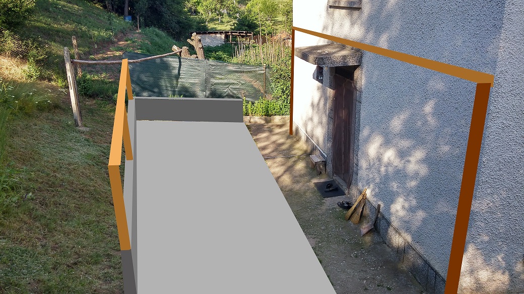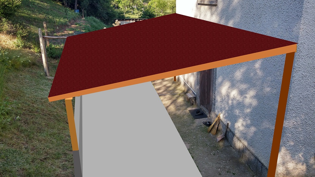 Замислил съм да направя един навес до къщата. Понеже пред входната врата има един склон, много често през зимата се събира доста сняг. Идеята ми е да направя бетонна площадка, да вдигна 1м стена от към склона (може и до някъде от двете страни) и да вдигна навес.