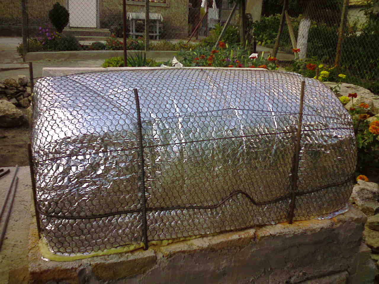 С няколко думи: избрах си кофти място, което уляга, заради някакви стари ями, а и е под наклон. Копаене, трамбоване, копаене, трамбоване... Изливни пилоти, дълги около метър, обединяваща греда, плоча за барбекюто, всичко, предварително армирано и излято наведнъж - две седмици.