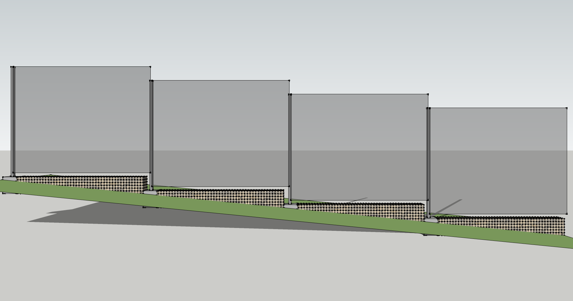 - Класически бетонов цокъл, В=30см, Ш=20см, Д=250см. Цокъла предвиждам да е вкопан 5 см в ниската и 30см във високата част на терена, и да представлява самостоятелни единици от по 250 см, така че да не е консруктивно свързан с оградните колове (да не компроментира линията на оградата дори да улегне / размести във времето). Предимства: не се сещам друго, освен че "така се прави". Недостатъци: изисква бетонпомпа/бетоновоз, доставка на арматура, приготвяне на кофраж (който след това ще артиса -> CO2++), мястото ще се превърне в строителна площадка, скъпо.