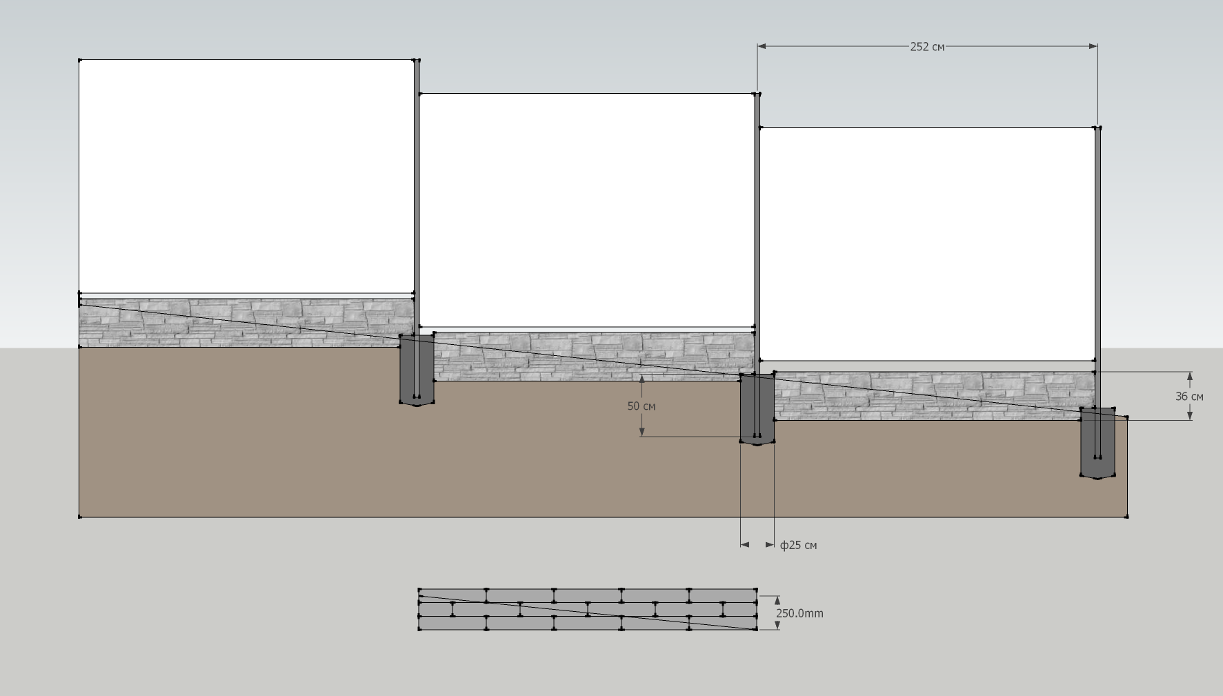 Обаче, терена има лека денивелация по линията на оградата (ок. 1:10), и по-силна денивелация напречно на оградата. За да реша въпроса с денивелацията, трябва да направя цокъл. Обмислям следните три варианта:
