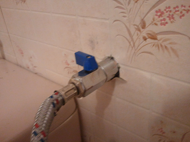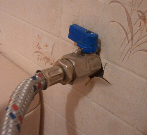 тече малка струичка (по-точно поредица от капки) надолу по стената под крана.