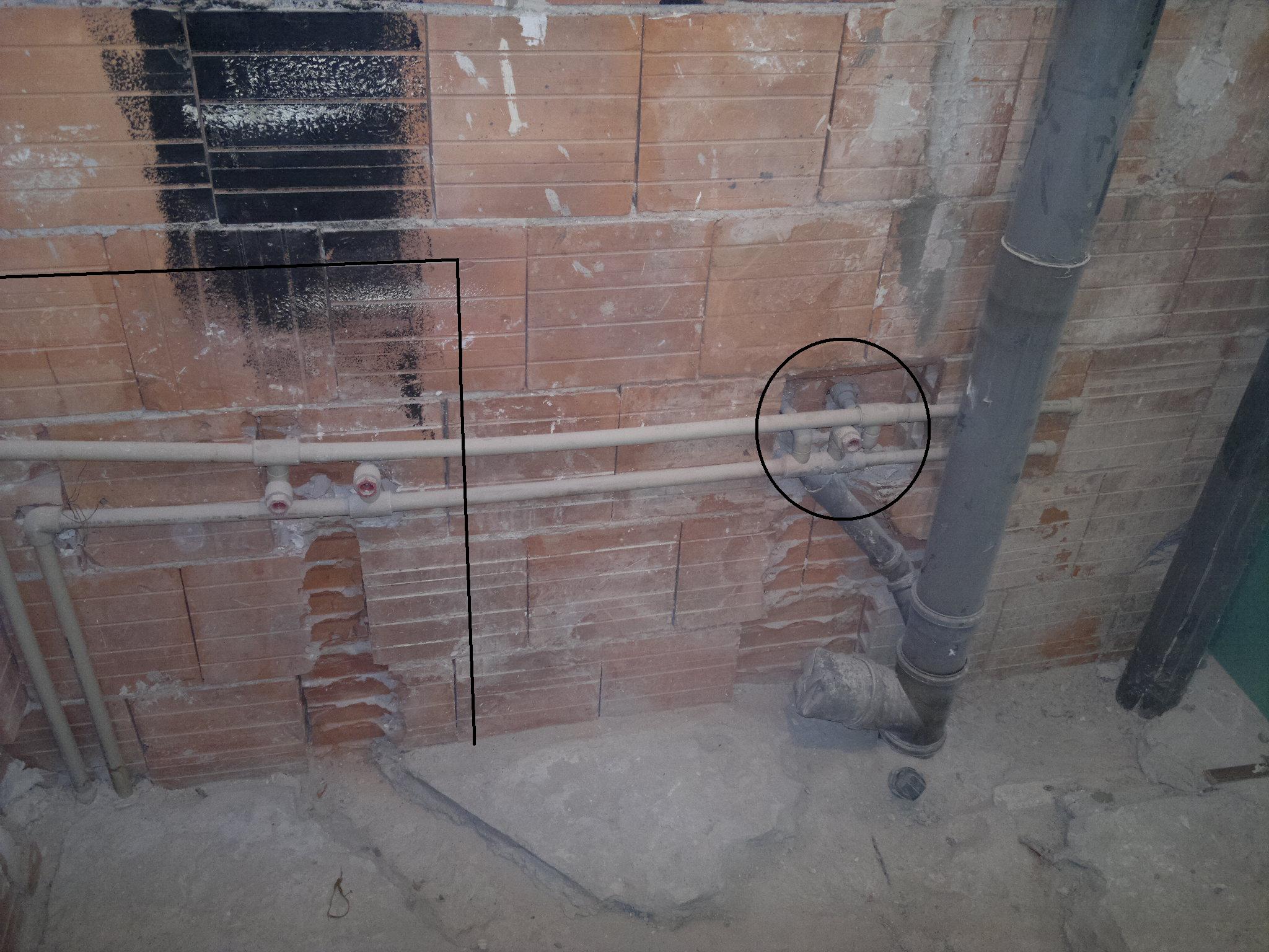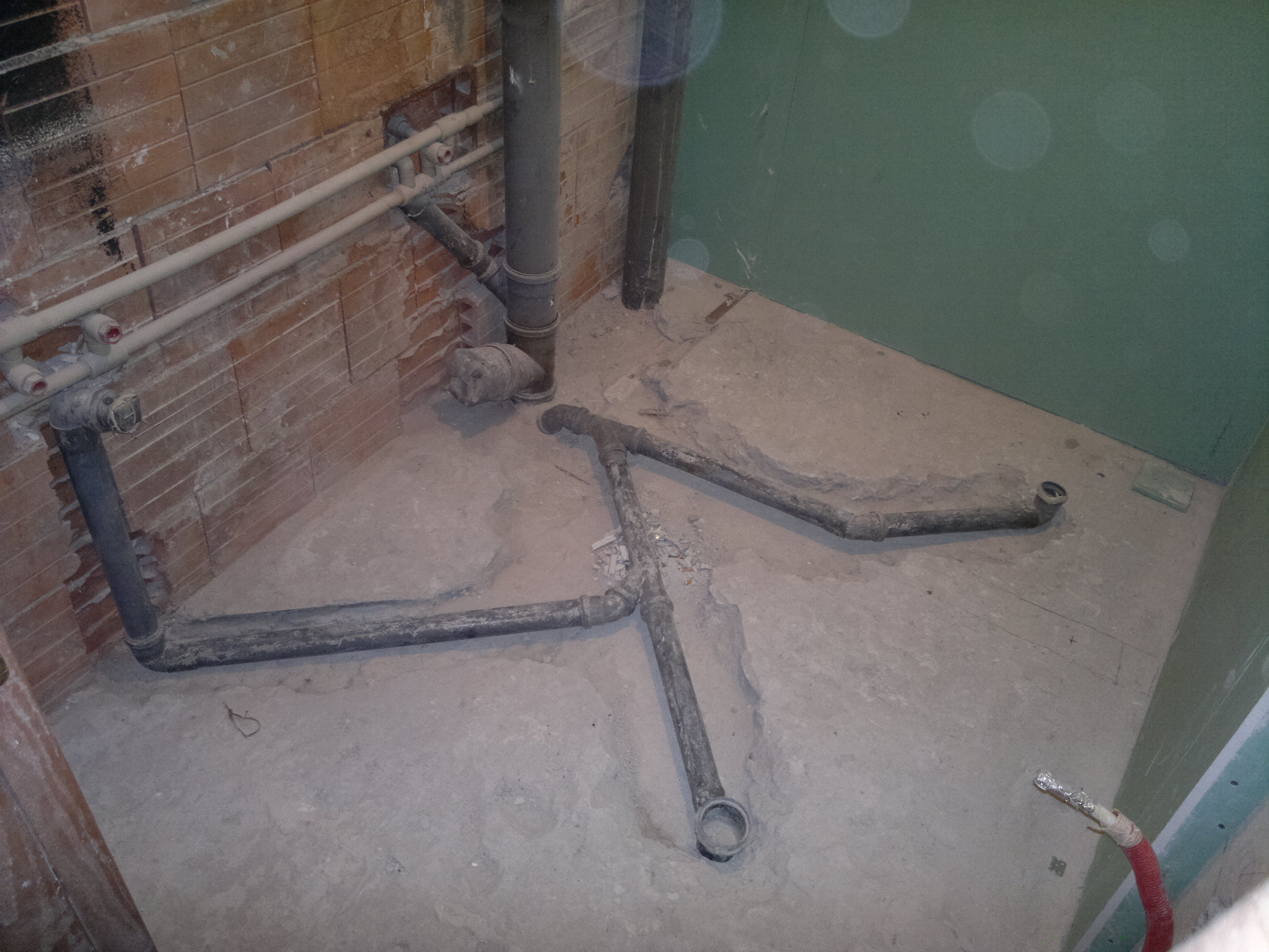 Изкъртих всичко и заварих тръбите в това положение: Махнах всичко и понеже започвам на чисто искам да ви попитам как е най-правилно сега да си прекарам тръбите на канала - за душ коритото, за шкафчето с мивката, и за мивката на кухнята (чиято тръба минава през тухлената стена - зад тухлената стена е кухнята). Не искам да имам сифон в центъра на банята, така че разклонението за него отпада.