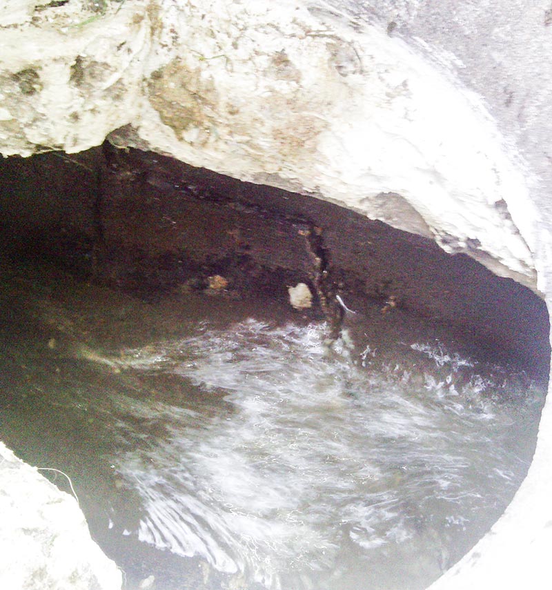 Наскоро забелязах как каменина на канализация минаваща през двора е спукан по долната окръжност. Това което се вижда е през шахта от бивша тоалетна (снимка 1). Вода (чиста) тече постоянно с такъв дебит, но мисля може да се спре за около 1 час и ако се протегна ще имам достъп до спуканото място за да го подмажа (вижда се на снимка 2).