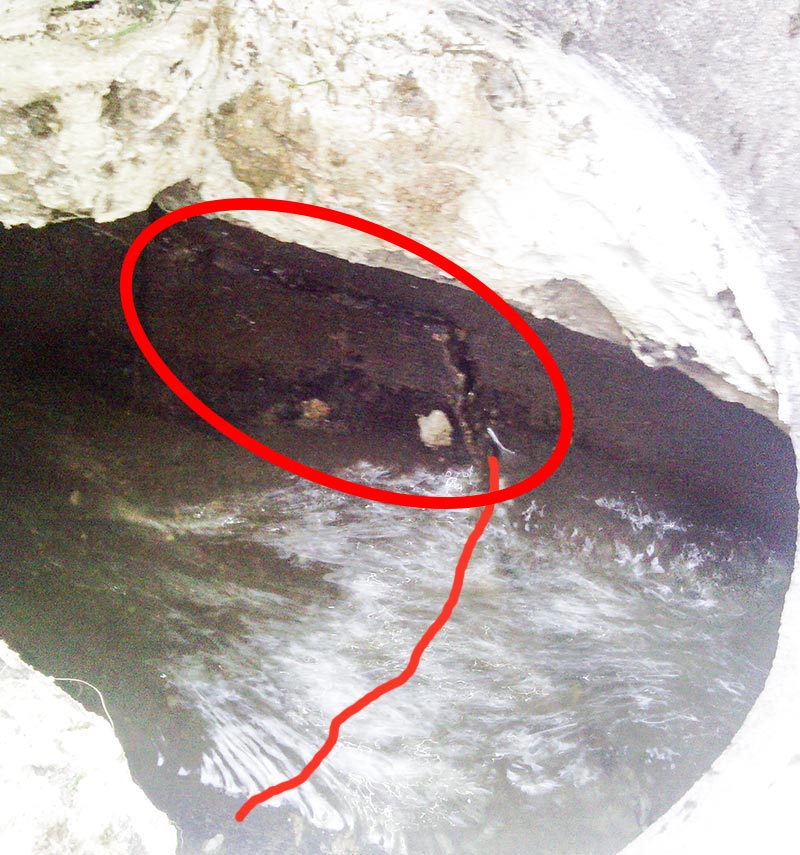 Наскоро забелязах как каменина на канализация минаваща през двора е спукан по долната окръжност. Това което се вижда е през шахта от бивша тоалетна (снимка 1). Вода (чиста) тече постоянно с такъв дебит, но мисля може да се спре за около 1 час и ако се протегна ще имам достъп до спуканото място за да го подмажа (вижда се на снимка 2).