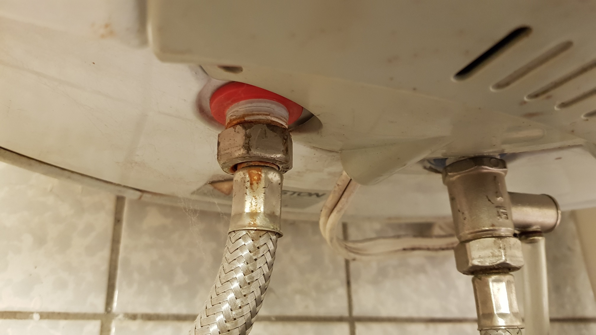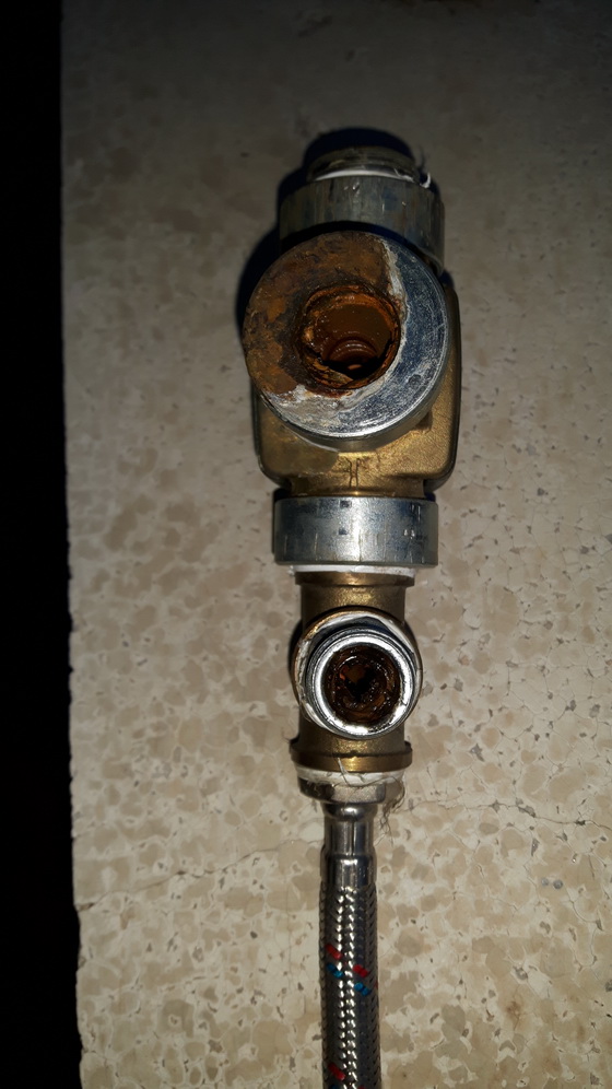 Натрупвания предимно от ръжда около използваните поцинковани фитинги са довели до запушване най-вече на щуцера на гъвкавата връзка от изходящата към смесителите вода. Но наслагвания има и на други места.