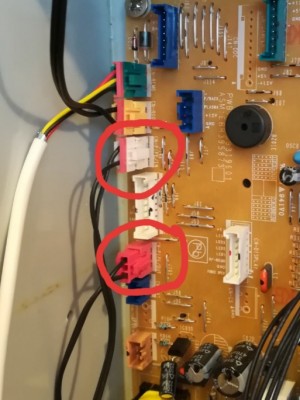 С мен се свърза съфорумник, който от скоро има същата термопомпа. Та искаше да "сверим часовниците".И един от въпросите, които обсъждахме остана без твърде категоричен отговор. На снимката са оградени буксите на двата фреонови датчика, означени с in и out. Кои вх/изх се имат в предвид от към външното тяло или от към топлообменника?