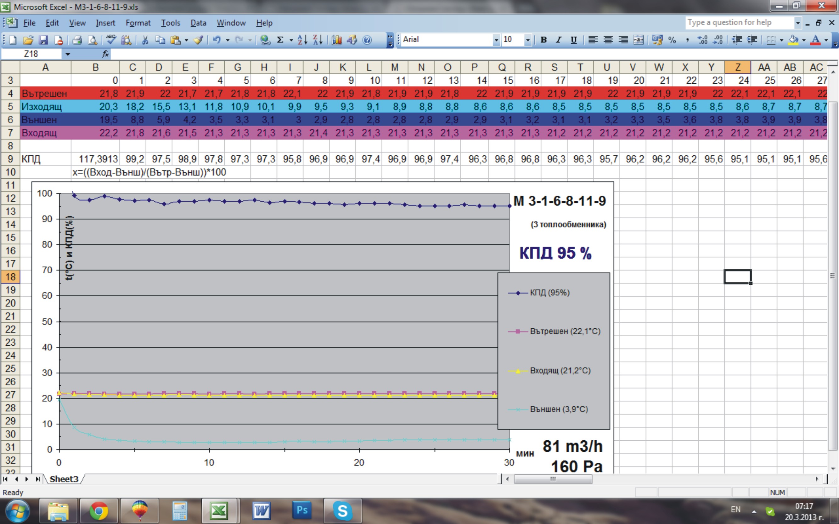 Номерирал съм си топлообменниците с 1, 2 и 3. В "кожуха" ми беше останал 2 номер (от лятото) и почнах с него. Температурната разлика я правя с печка "духалка". В долния ляв ъгъл има схема на потоците (с червеното е този от печката). Постарал съм се стрелките на дебитите визуално да показват разликите. Налягането го меря между вентилатора и рекуператора. Дължината на стрелкичката е пропорционална на налягането, а дебелината и - на дебита. Дебита го меря след рекуператора. Вход-изходите съм номерирал от 1 до 4.