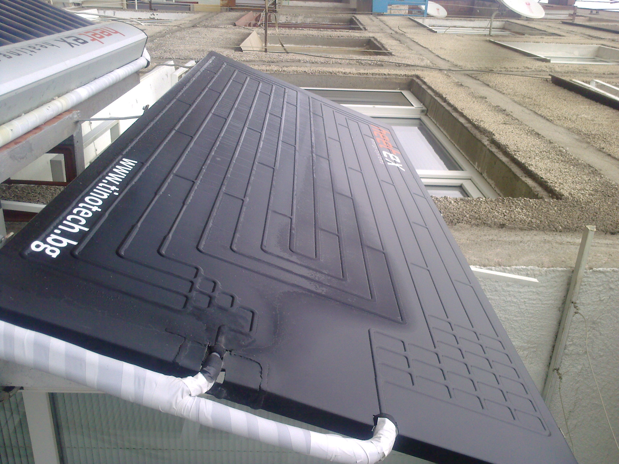 Вероятно така си "спасил" в голяма степен пластините от влагата, запушвайки ги и така те са прихванали по-малко от нея :). ..... и сега ме накара да се размърдам и погледна състоянието на питата и панела :) ...... и се оказа че при слабо преваляващият сняг и +2.4грС околна температура, вътр. темп.: 21гр, делта Т : 27грС, Тизх.: 48.4грС панелът има на входа си: -9.1грС, на изхода: -0.1гр.С, в долната си половина има помътняване на повърхността като че ли е изпотен ( но не е), а най-ниско долу има заледена тънка повърхност, на места с ледени капки. Снегът не се задържа (заради наклона и "сухият" панел вероятно)...и за да не описвам прекалено го снимах :)