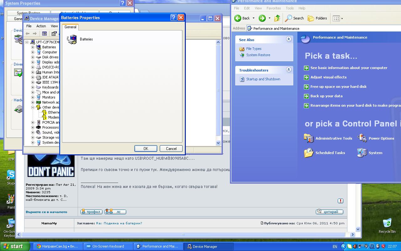 Здравете отново,в момента равотя с едно сони и батерията му показва,че е заминяла.Лошото е,че постоянно писка от два дни.Когато я махна спира компа.Каква настройка му е нужна,че да си работи без нея.Благодаря предварително.