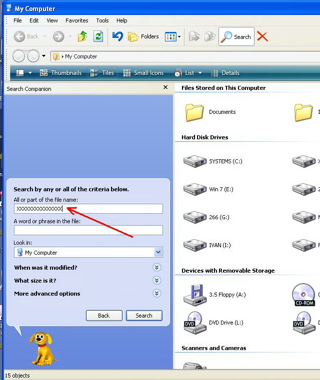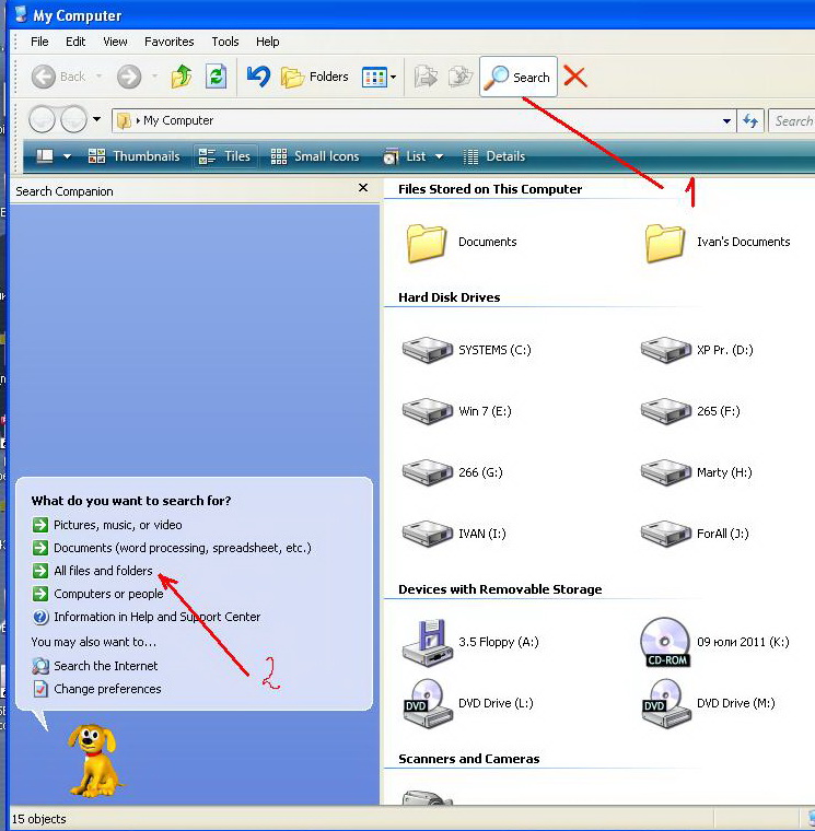 Отваряш Windows Explorer /жълтата икона на My Computer/ , а не Мозилата. След като натиснеш "лупата" /1/, се отваря по начина който виждаш на картинката. Там "цъкаш" на All files...... - 2/ - картинка 1. В отворения прозорец пишеш където е стрелката - картинка 2. Натискаш Search и .... чакаш да сканира.