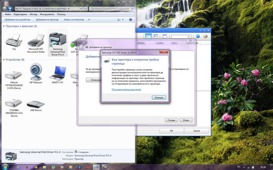 Ти разреши споделянето, за да го видиш. Специално за тебе инсталирах принтера и на лаптопа. Първо разреших споделянето на принтер в домашната мрежа. Там на картинката на един бутон пише "добавяне на принтер". Тръгна да търси, видя го и инсталира драйвери за него от нета. Отпечата пробната страница даже. Това е. Тоя samsung universal print driver го заеби.