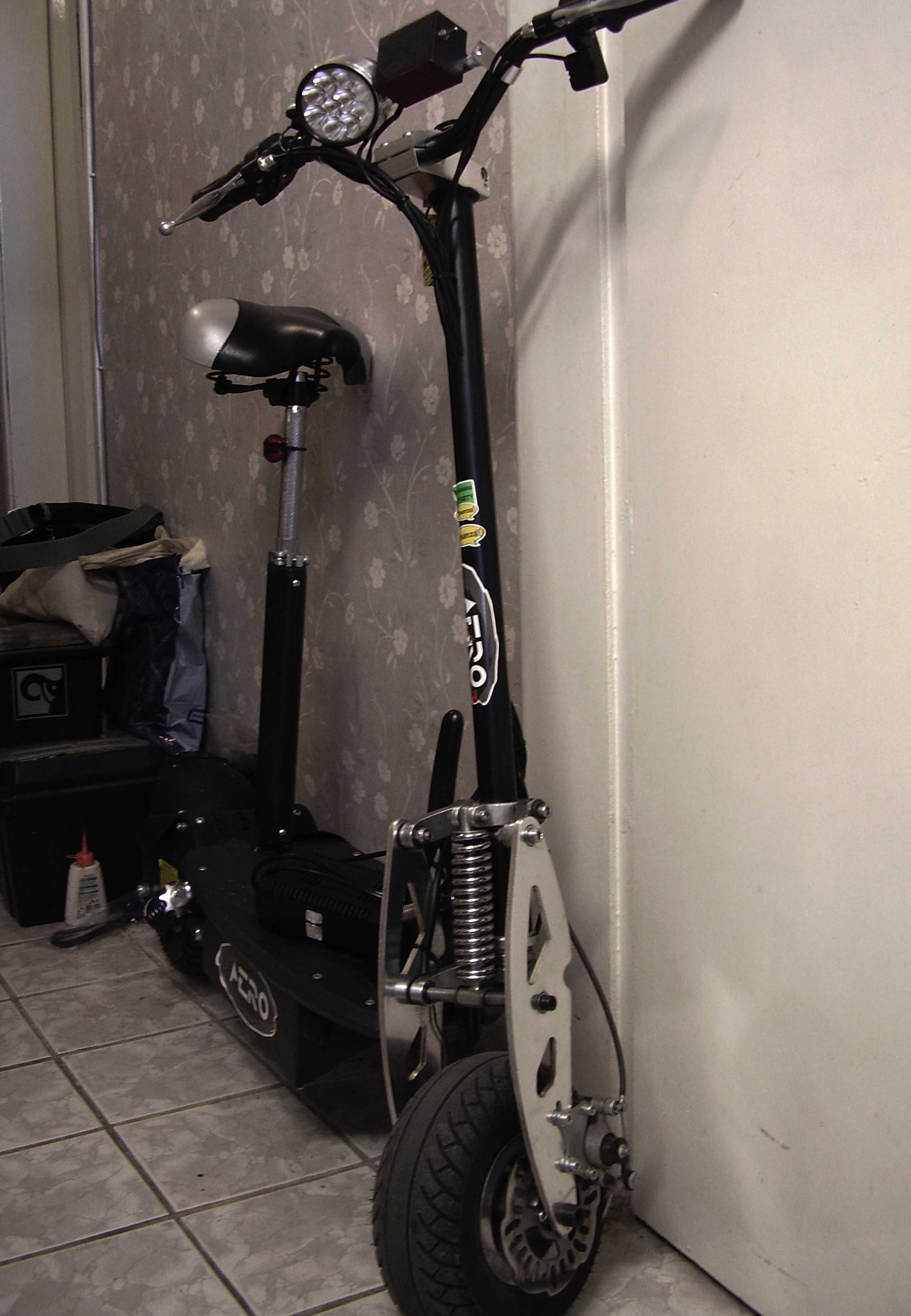 Здравейте, фактически тази тротинетка я карам за втора година. Преди това имах една друга но я продадох и си взех тази понеже вече се бях зарибил. Купена е от София. Лесно ще намерите магазина ако напишете e-scooter 800W. Тротинетката е на 36V, 800W, батериите 12Ah - оловни. Успешно изкачва подлезите с моите 80кг. отгоре. Миналата година сложих по-бърз заден венец (тротинетката е с верига). Максимална скорост по равно шосе - 23км/ч. Не знам ако модна ШИМ-а, дали няма да тръгне по-бързо. Така и не намерих време да я закача на осцилографа. Батериите още си държат капацитета или поне не са се променили осезаемо. Сериозно съм се замислил за някоя модерна 3 килограмова батерийка. В същност това е и причината да си сложа амперметъра. Исках да добия представа в какви граници се движат амперажите при тръгване, тръгване с мръсна газ и палене на гуми :-D , нагорнище и т.н., и да си направя сметка каква батерия ми трябва. Но това май ще е догодина, нека се скапят първо тези батерии. Иначе от снимката се вижда най-общо как изглежда тротинетката, седалката се вади барабар с колчето, може да се кара изправен. Центъра на тежестта е ниско и това прави тротинетката изключително стабилна. Има приятно меко окачване. Има и доста слабости. Например : няма калници! Кара се само при сухо време. Като цяло изработката е типично китайска, изпуснали са да вземат ноухауто от германците (понеже оригиналния вариант е Германски). Това е в общи линии. В Youtube (e-scooter 800W) има клипове.