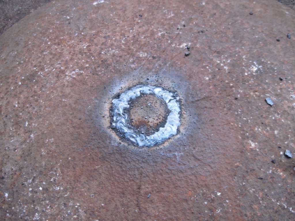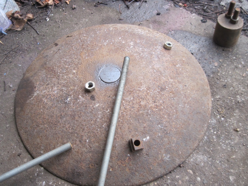 Още днес започнах да търкам ръждата и да заварявам. Тъй като в събота спя до късно и се размотавам - не свърших много работа...Поизчистих ръждата и затапих отвора в средата. За утре-останаха дръжките и крачетата. Намислил съм да заваря по една гайка М16 и крачетата да са шпилки, или тръба със заварена в единия й край шпилка ( или болт).