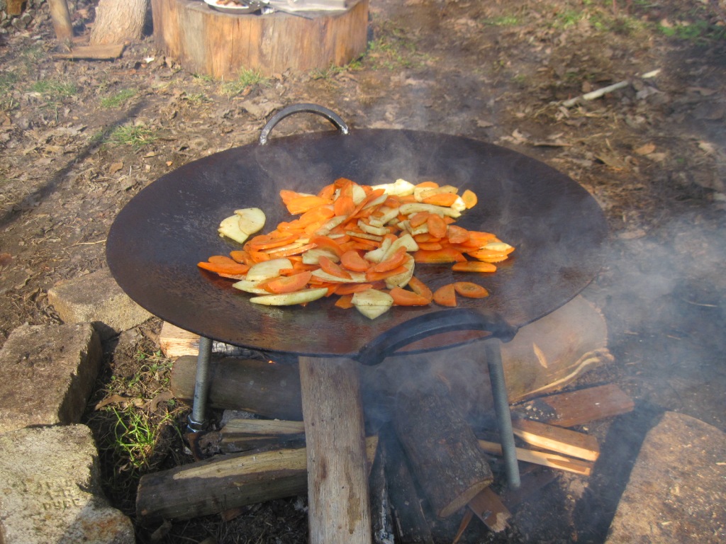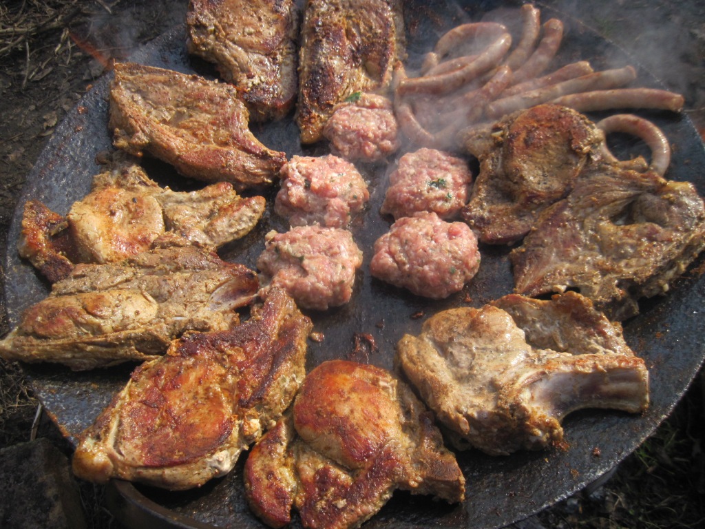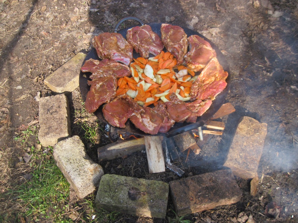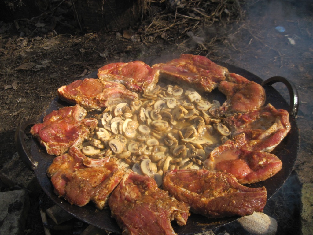 Такаа. дойде време за сефтосване на валандара. Много обяснения не са необходими, снимките говорят достатъчно.В началото поизпържих малко сланинка, след което- морковчета, после пържолките по края. докато се печаха от едната страна- морковите станаха готови. На тяхно място метнах гъбки. Накрая няколко кюфтенца и кърначета за проба.
