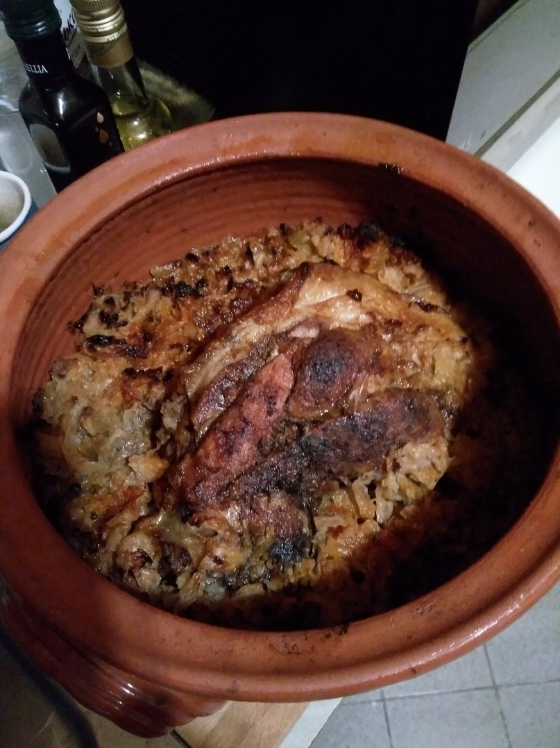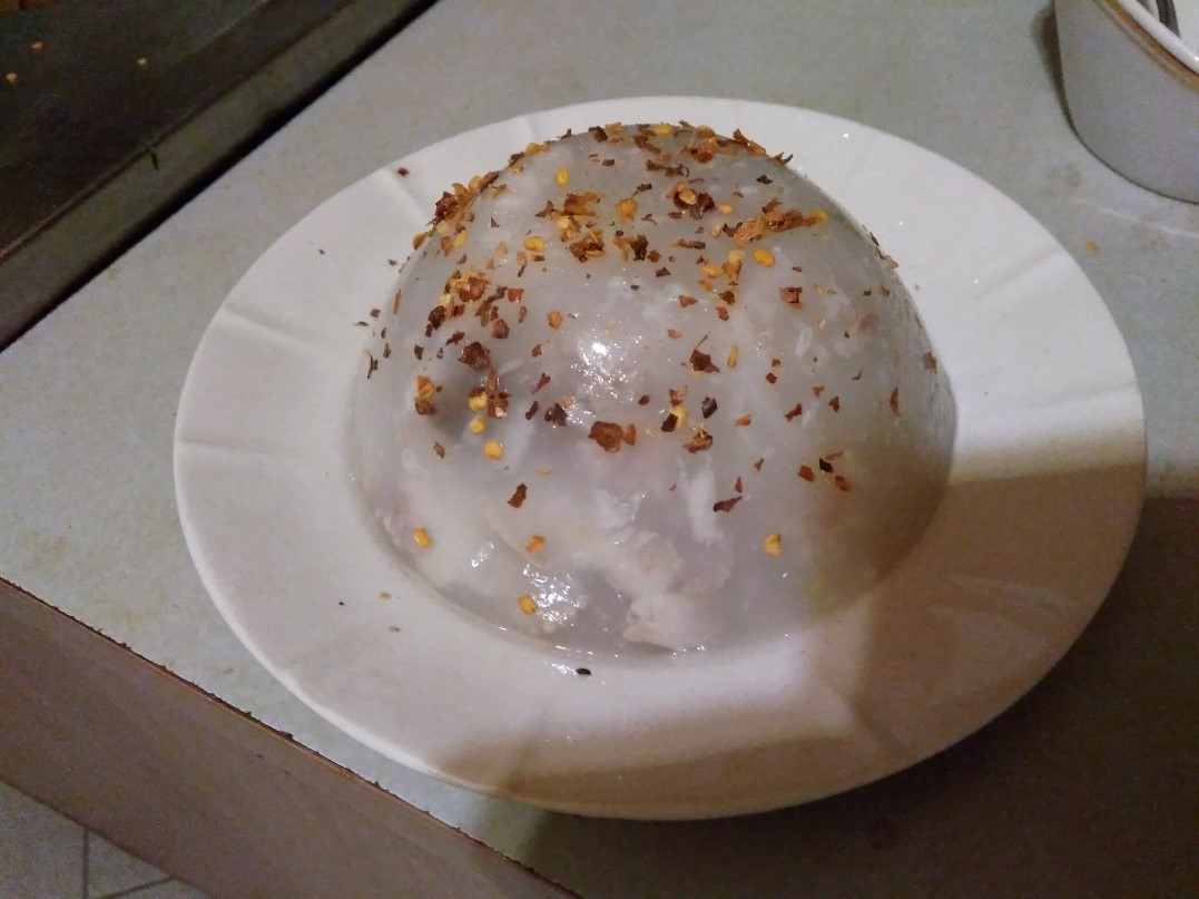 Като я взема от мама (тя оперира с тенджерата под налягане), я стоплям, добавям сол, оцет и чесън и, това е важен момент, си я разсипвам в подходящи съдове. Като стегне, само топвам купата в гореща вода и обръщам.... ако искаш красива сервировка, в купата първо наслагай малко магданоз на ситно или няколко цели листенца и внимателно залей. Као стегне, допълни ... Та, като обърна тази красота, та като я нарежа... Ох...