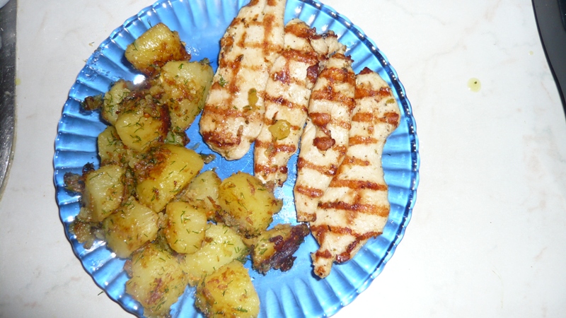 Накисваме пилешкото филе в предварително приготвената марина,от пилешкия бульон,черен пипер,соев сос,олио и риган.За няколко часа.След което ги изпичаме на скарата.Сваряваме предварително измитите картофи с обелката.Хубаво е да не са хубаво сварени, за да не се разпаднат в последствие при задушаването.Оставяме да истинат хубаво и ги обелваме.След което ги нарязваме на едри кубчета.Настъргваме на ситно ренде чесъна и го прибавяме към предварително разтопеното масло в купичка.Задушаваме картофите в дълбок тиган, със част от сместа масло и чесън,до златиста коричка на картофите.Преди да ги извадите от тигана,поръсвате с пикантина и копър.Разбърквате за последно и ги вадите от тигана.Задушавайте на малки порции картофите,за да не се разкашкат.