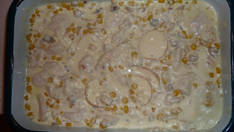 Нарязваме на ситни кубчета лука и гъбите.След което ги задушаваме в мазнината.После добавяме и пилешкото филе,предварително нарязано на кубчета заедно с царевицата,пилешкия бульон,черния пипер и бялото вино.Задушаваме около 15 минути.Изключваме котлона и прибавяме заквасената сметана.Разбъркваме и готова смес исипваме в малка тавичка.Добавяме топеното сирене и настъргваме от горе кравето сирене.Запичаме в предварително загрята фурна около 15 минути.Не се добавя сол.Пилешкия бульон осолява достатъчно ястието.Поднасясе с чаша бяло вино.