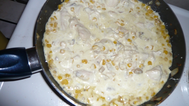 Нарязваме на ситни кубчета лука и гъбите.След което ги задушаваме в мазнината.После добавяме и пилешкото филе,предварително нарязано на кубчета заедно с царевицата,пилешкия бульон,черния пипер и бялото вино.Задушаваме около 15 минути.Изключваме котлона и прибавяме заквасената сметана.Разбъркваме и готова смес исипваме в малка тавичка.Добавяме топеното сирене и настъргваме от горе кравето сирене.Запичаме в предварително загрята фурна около 15 минути.Не се добавя сол.Пилешкия бульон осолява достатъчно ястието.Поднасясе с чаша бяло вино.