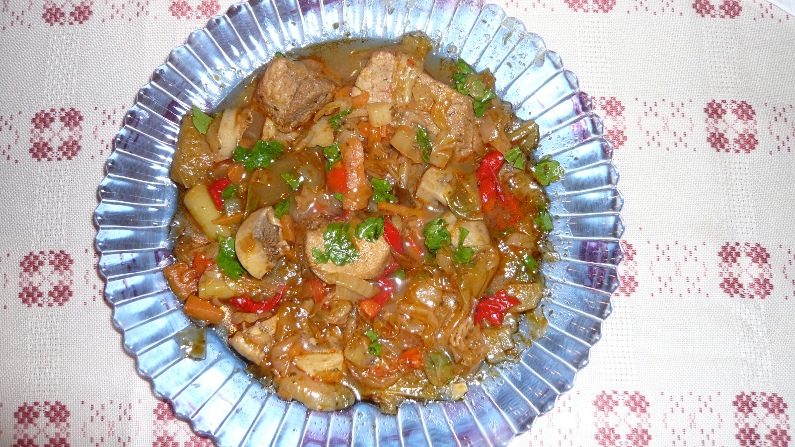 Нарязваме месото на голями парчета, като ги овкусяваме с черния и щипка от червения пипер,щипка сол и малко олио.Оставяме на страна да попият добре подправките и слагаме да пържим в згорещена мазнина.Месото се пържи до зачервяване.Нарязваме чушките и морковите на ленти,кромидия лук на полумесеци,а праза на парчета около 3 сантиметра.Изваждаме месото от тигана и на негово място в същата мазнина запържваме зеленчуците без гъбите.Преди да отстраним тигана от котлона слагаме и лъжичката с червения пипер,като разбъркваме няколко пъти и отстраняваме тигана.В глинено гюведже прибавяме месото,едро нарязаните гъби,запържените зеленчуци,сол на вкус,дафиновия лист и чубрицата, като доливаме вода в зависимост от това дали искаме по гъста манджа или да е с повечко бульон.Печем в предварително загрята фурна на 180-200 градуса около час и половина.Накрая поръсваме с магданоз.