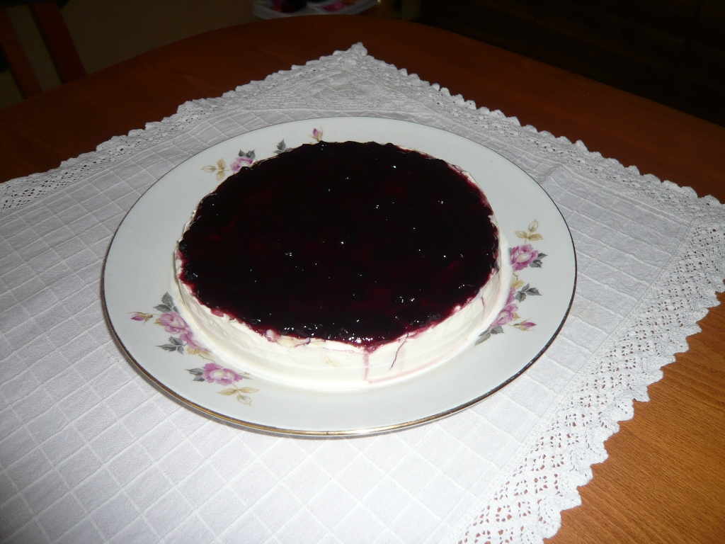 В дълбока купа слагаме сиренето.Добавяме 200 гр. от сметаната,захарта,брашното и ванилията и разбъркваме.След което добавяме предварително разбитите яйца и бъркаме на ръка, до получаване на хумогена смес.Получената смес изсипваме в предварително изпечения блат в формата и печем на 160-180 градуса на средна фурна за около половин час или до като средата на кейка не придобие консистенцията на желе.След което оставяме да изтине и прибираме в хладилника за 12 часа.Изваждаме кейка в чиния, като намазваме с останалата-200 грама сметана и с конфитюр от боровинки.