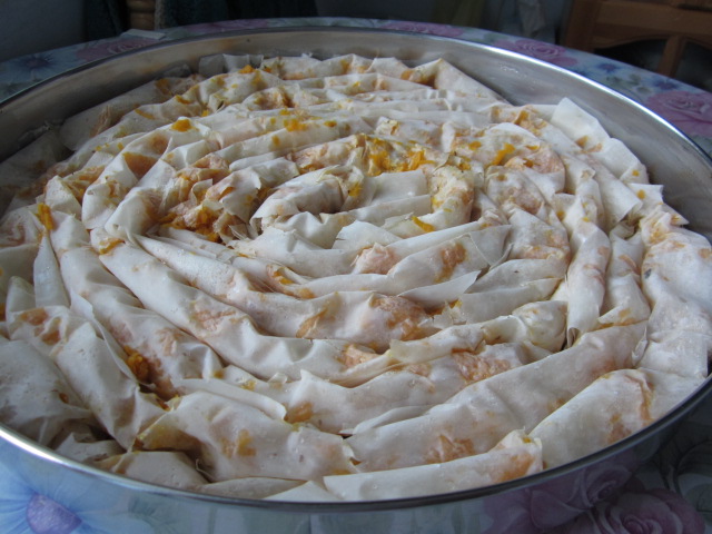 ...корите се разстилат...в/у най-горния лист се поръсва малко олио,захар,орехи и малко от охладената след запържването тиква...