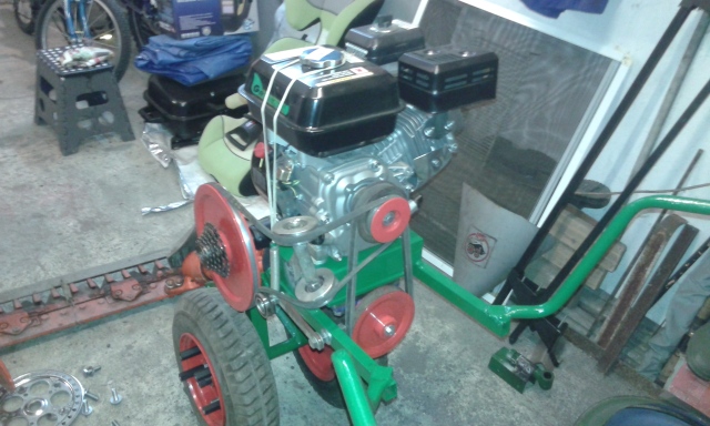 Сега протича промяна на концепцията със съединител от двигателя към косилния апарат и ходовите колела,които ще са зацепени заедно. Имам възможност да отцепвам задвижването на ножа. Скоро ще съм готов за следващата проба и до синхронизирам скоростта на движение и скоростта на косене. Прикачам снимки от първия проект в работна фаза.