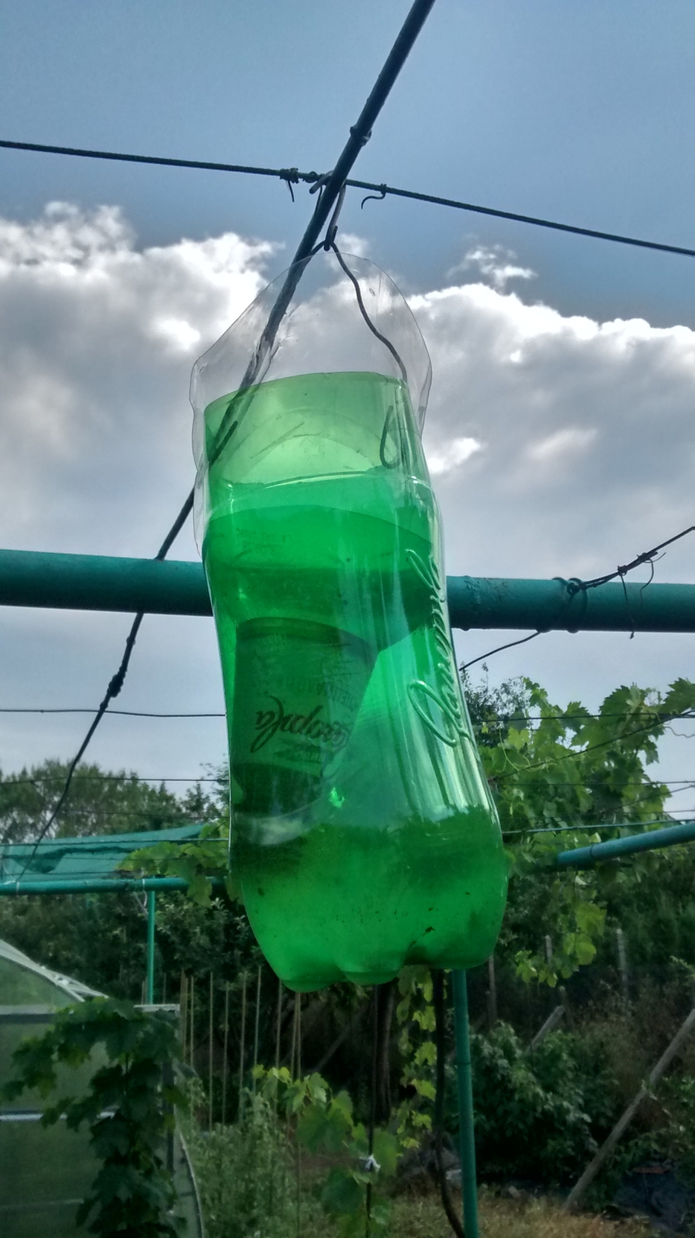 А за осите - капани бутилки с отрязано гърло в конусната част и обърната обратно - малко бъркоч бира, захар /понеже няма още круши - есенция за ракия круша. Осте полудяват на мирис на круша.