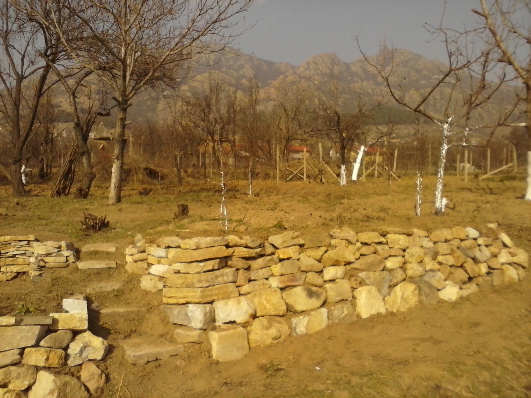 Ами аз вече набучих доста на други места както и в съд на тъмно, и за сега всичко върви О кей за разлика от овощните дръвчета които всеки момент ще цъфнат, а ги сях само преди 2 месеца има няма. Най странното е,че докато чистих двора, имаше саморасли сливи, тези които са по прави след отстраняването им ги използвам за колчета, и едно такова забих на едно от младите дръвчета и днес го гледам напъпило колчето и ще цъфне, а го сякох когато засаждах овошките, странна работа е това природата. А относно местоположението, намира се в вилната зона на град Сливен. Има още едни 7-8 метра от дясната страна за терасиране, но там ще е на едно ниво тъй като терена не позволява 2, и ще започне метър и нещо със завършек на нула. Но там ще трябват двойно камъни, просто времето не ми стига, извършвам няколко дейности една след друга, и едно захващам, после друго и така по малко. А ето и завършека от днес на горното доварче, наредих му още една количка и половина :