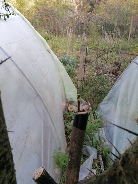 Да покажа тази година какво стана. За протокола: присаждано е само върху жълта джанка. Калемите от сливата са сорт Рут Гещетер и са събирани февруари и съхранявани в найлонова торбичка в хладилник, а от черешата са отрязани в деня на присаждането, като пъпките вече бяха наедрели. Присаждано е по метода "кози крак" и "под кора". Вижда се, че някъде от 4 калема е тръгнал един, а някъде повече, но след като сваля лентата ще кажа кой метод има по-висока успеваемост. Успех на всички в експериментите.