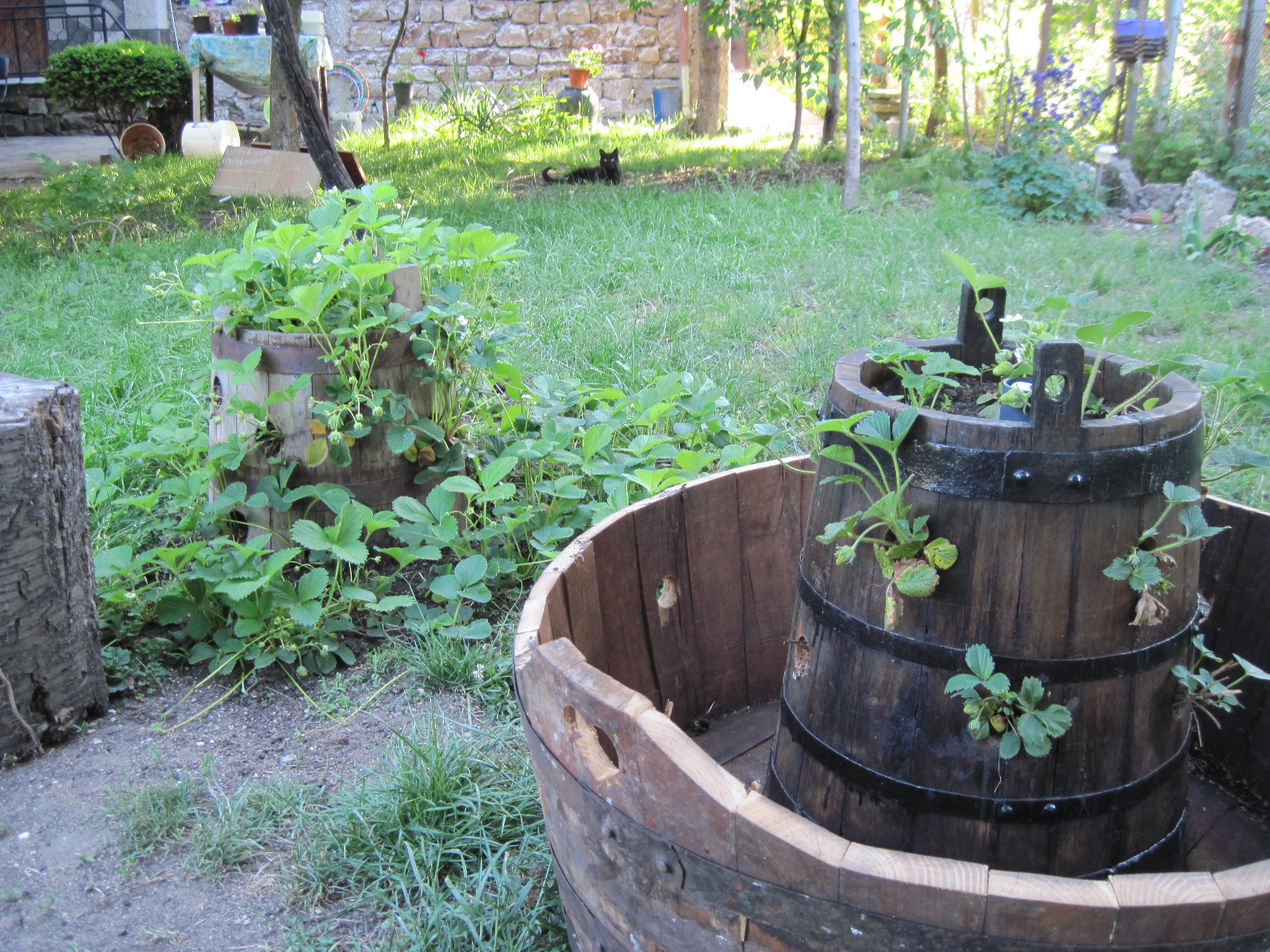 Миналата пролет си купих един керамичен ягодарник, но освен него направих и един от едно старо каче. Снимки качвам чак сега, когато започнах да дупча още едно, което за абсолютно нищо друго не става.