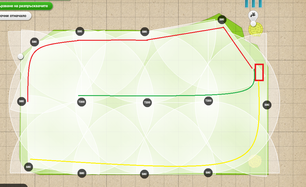 Като разположа така разпръсквачите, имам места, които се покриват от 3, притесняваме да не станат локви на тези места. Също така горе в ъгъла ми се покрива само от 1.