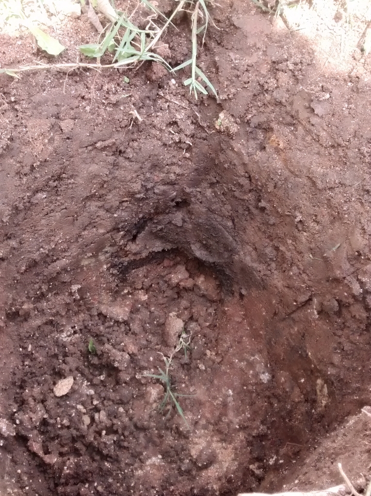 Набързо: Както споделих в моята тема за превръщането на лоза в асма започнах подготовката за засаждане на новите ми лозички .... не ползвам старите места, че настъпиха промени, но на едното място се получи следното положение: когато изкопах дупката в единия й ъгъл се оказа, че се копае някак странно ..прекалено леко и прекалено влажно... Както ще видите на приложената снимка, се вижда някакво черно оцветяване на пръста там , но не е само това. Значи като се опитам на съответното място мога без усилие да забия настрани почти по един метър 12мм арматура и тя потъва като в рядка кал.. извадих малко пръст от "черното" и там започна да се оформя и то много бързо цяла локва и сега съм на кръстопът : от тая вода ( когато я има ) ще ми изгният корените на лозата или ще е осигуровка за едно извънаредно поливане след всеки дъждец? Да слагам ли въобще лоза там ?
