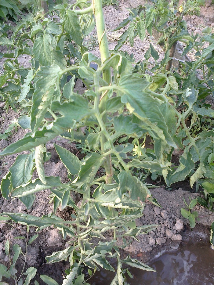 Здравейте,за първа година се занимавам с земеделие и не съм много вещ ,та да попитам какъв му е проблема на това доматенце че стана така.Поливам след 18:00 ,не вярвам да е от поливката...