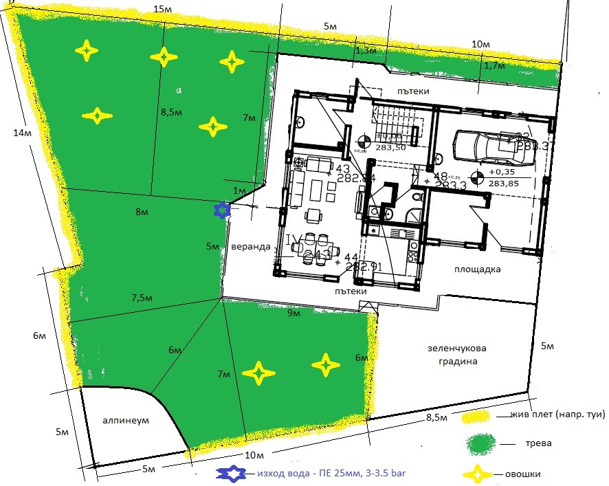 . Тръбата за напоителната система излиза под верандата и смятам там да е колектора с програматора (отбелязано с еврейска звезда на картинката). Дотук е сигурно, че ще пусна плътно до пътеките 2 тръби 25мм към двете зони на зеленчука. Струва ми се умно и останалите магистрални тръби да вървят плътно до пътеките.