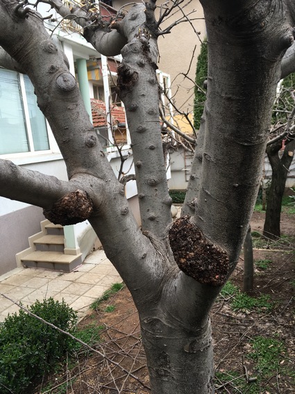 На тези места имаше клони. Отрязани са за формиране. Замазвах ги с овощарска замазка.