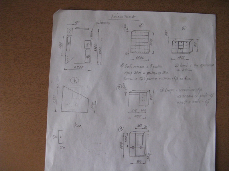модул 1 /библиотека/ - мисля си да я направя от два самостоятелни шкафа по 800мм широчина и да ги сглобя с винтове. Подобно на гардероб с основа повдигната на 5 см, страници отстрани и таван отгоре. Средният рафт хванат към корпуса за укрепване. Подобно на този модул: http://www.ikea.bg/living-room/Living-r ... 077/76153/, но таван лягащ на страниците.