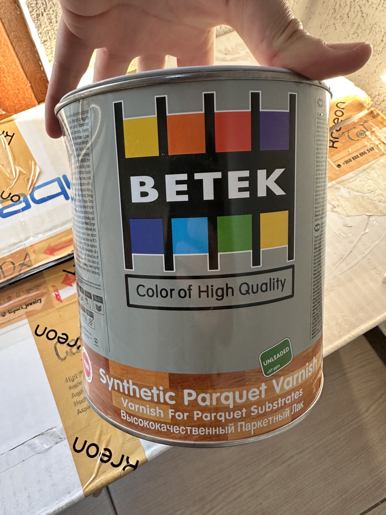 ОБАЧЕ, нанесли са безцветен лак BETEK полумат алкидно-уретанов и сега цвета си е точно като на обикновен дървен паркет от едно време.