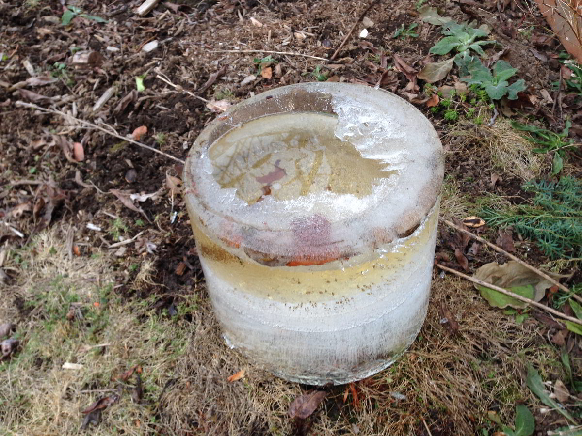 Днеска гледам една от пласмасова кофа съм забравил на двора пълна с вода и водата замръзнала през нощта. Обърнах я да видя какъв леден цилиндър се е получил. За мое учудване се оказа че отдолу има вода, и само дъното не е замръзнало, а отстрани са се образували ледени стенички. Получи се леден съд с вода вътре.