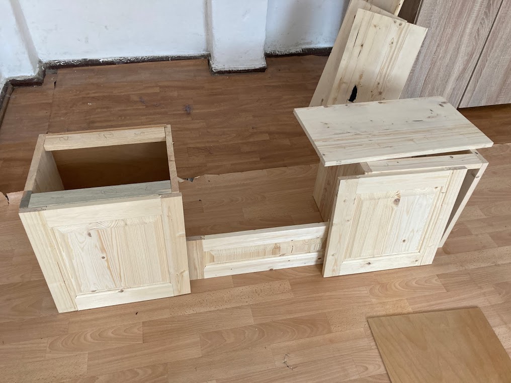 Най-после първата част от ТВ шкафа е готова. Плота и рамките на вратичките са от материал за дюшеме (смърч), но не съм доволен защото е от сърцевината на ствола и съм 90% сигурен, че ще сцепи след не много дълго време. Всичко останало е от стари палета.