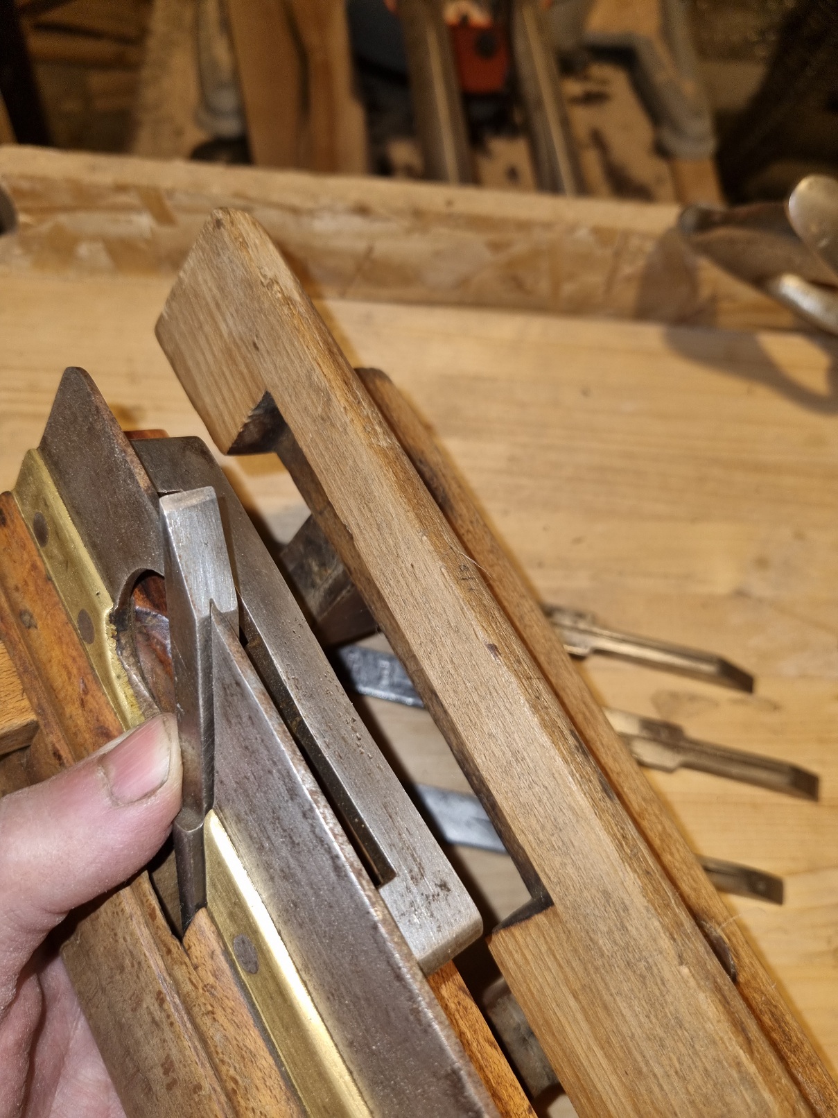 Сега видях че на неизвестния линеал отворите за закрепяне са издължени вертикално, което означава, че най-вероятно наистина е стопер за дълбочина. За металното перо обаче съм убеден, че носи ножа. Пускам снимки от едно мое ренде.
