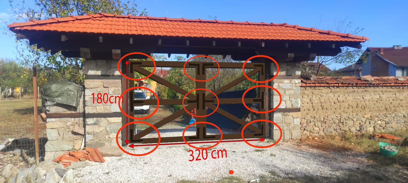 Решил съм да направя двукрила пътна порта. Светлото разстояние между носещите вертикални греди е 320 см. , което ще рече че всяко крило на вратата ще бъде широко грубо 160 см и високо 180 см. Гредите на скелета на вратата на които съм се спрял са 5/10 см.
