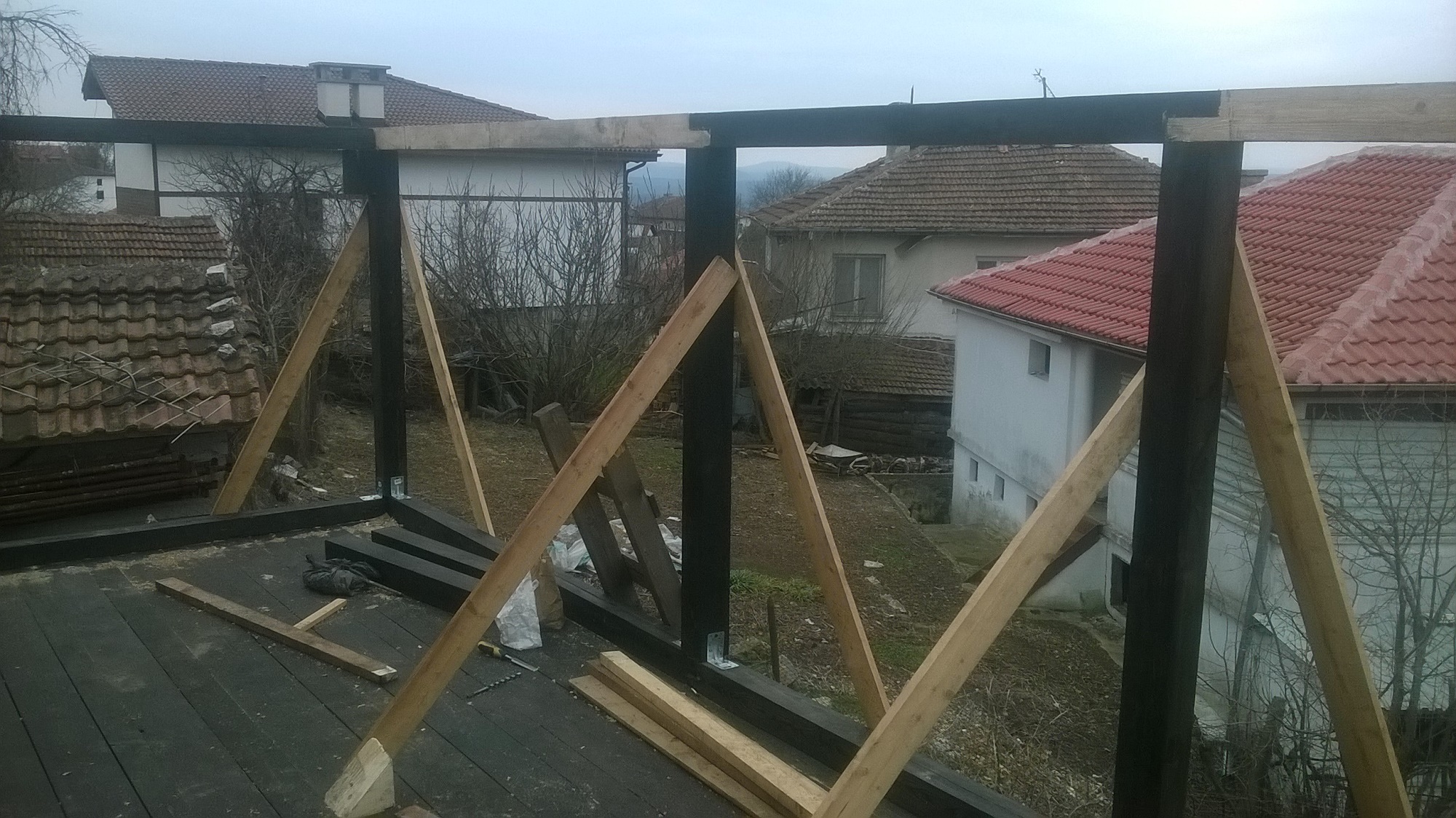 Благодаря за съветите Руди. Долните столици може би ще останат така, както съм ги замислил и допълнително ще бъдат подпряни с паянти с дължина около 70см между долните колони и столиците под 45 градуса. Подкоси отдолу за горните колони ще има и няма да пречат за парапета, който смятам да бъде плътен. Притеснява ме, че може би няма да мога да намеря сух материал за долните колони. Голям проблем ли ще е ако не е достатъчно сух. Живея в Бургас и ако някой знае къде в околността има наистина качествен сух материал (и си отговаря на размерите) - ще му бъда благодарен.